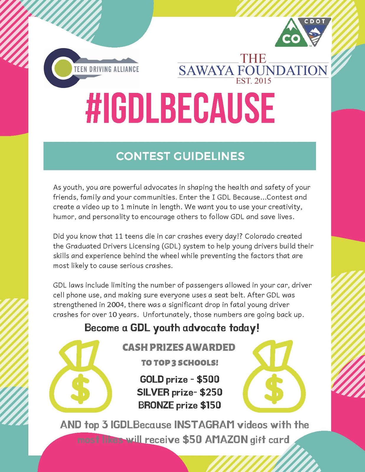 The “I GDL Because…” Campaign is happening now through April 30th! The goals of the campaign are to increase protective factors of positive social norms and connectedness and also to harness the power of youth advocacy to increase awareness of and adherence to GDL.